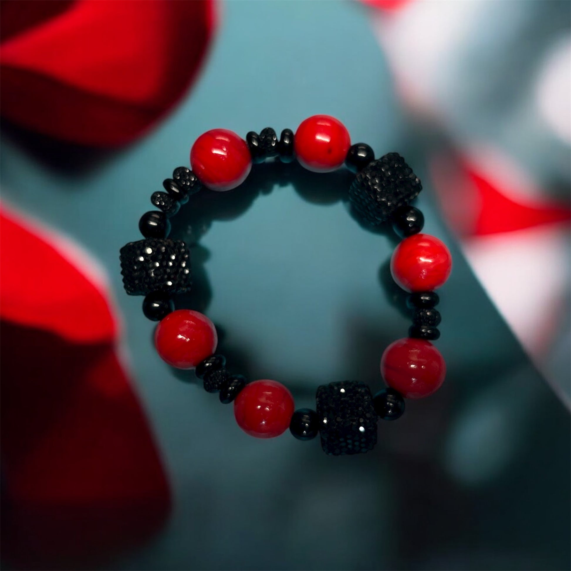 A expressive bracelet that is blended with lared focal beads, black stones, and black bling spacers. A true statement of a classic man!