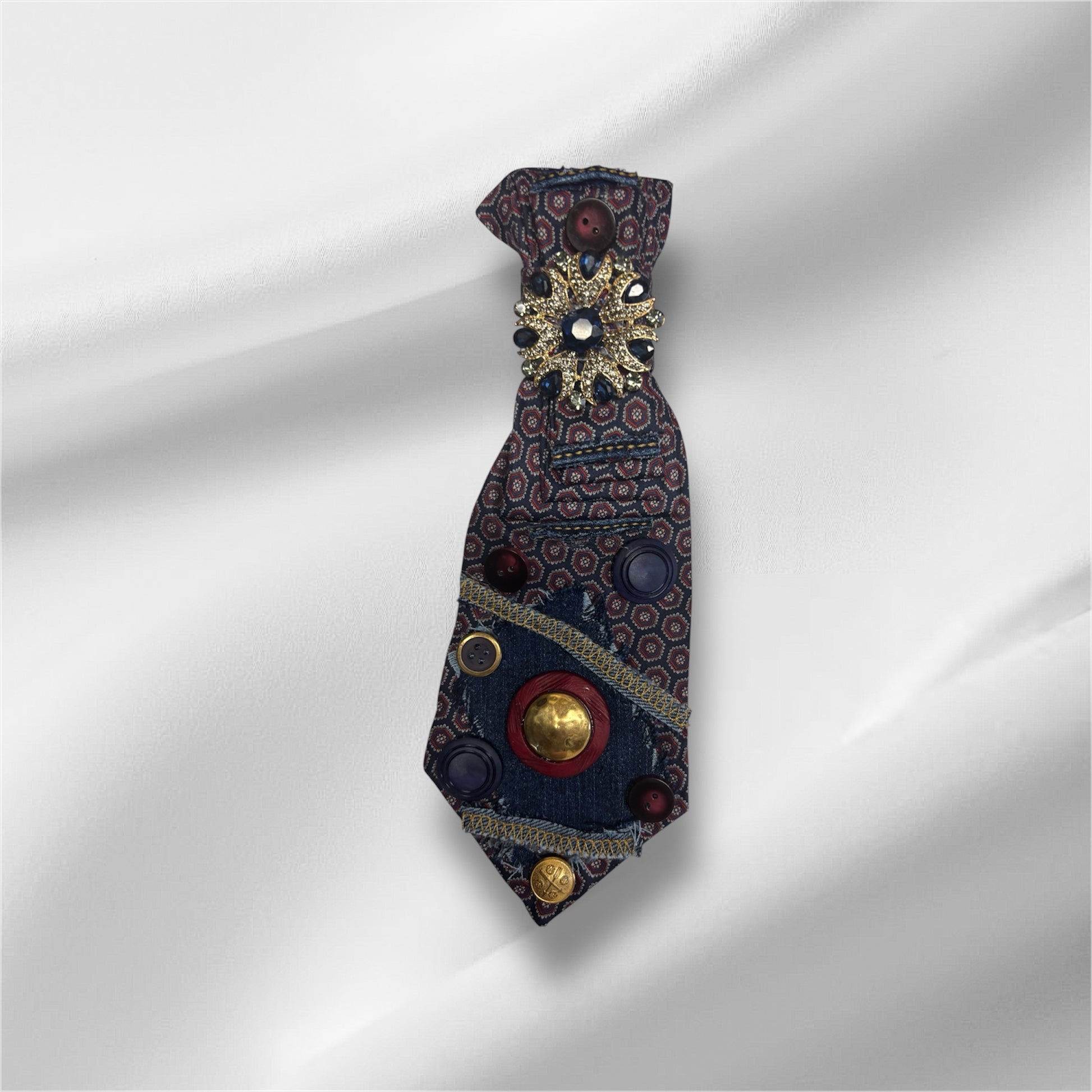 Custom Lavalliere with maroon and blue base. Blue jean accents embellished with gold, colorful beads, buttons and blue diamond jewels.