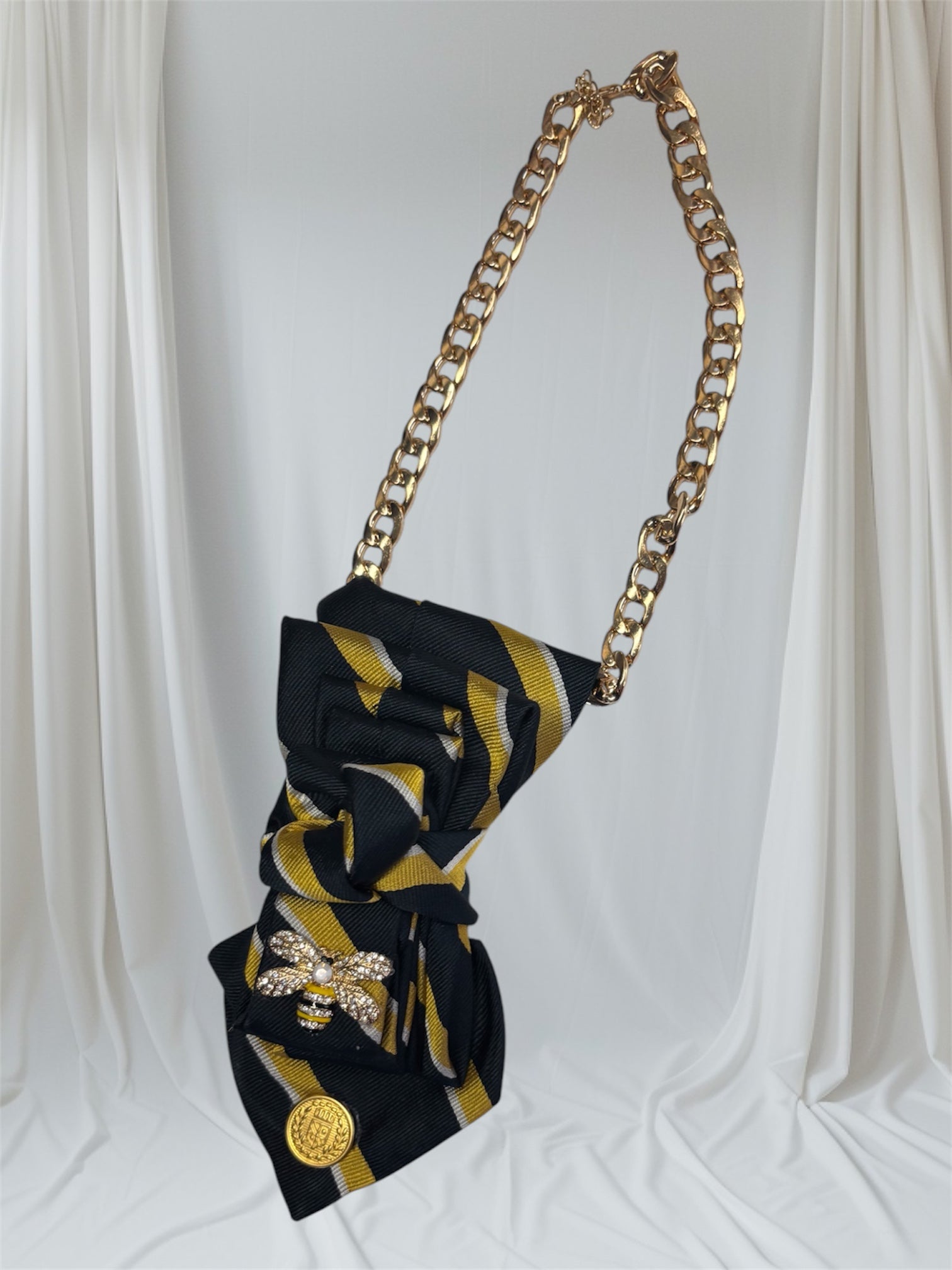 Add a custom lavalliere to your outfit. Stylish neckwear for the ladies. Multiple options to choose from. We also can customize for your special event or just your wardrobe choice. Blue and Gold tie with leopard print. Embellished with golden jewel and queen bee. Minimal embellishments for the classic ladies! Available with more interchangeable options available.