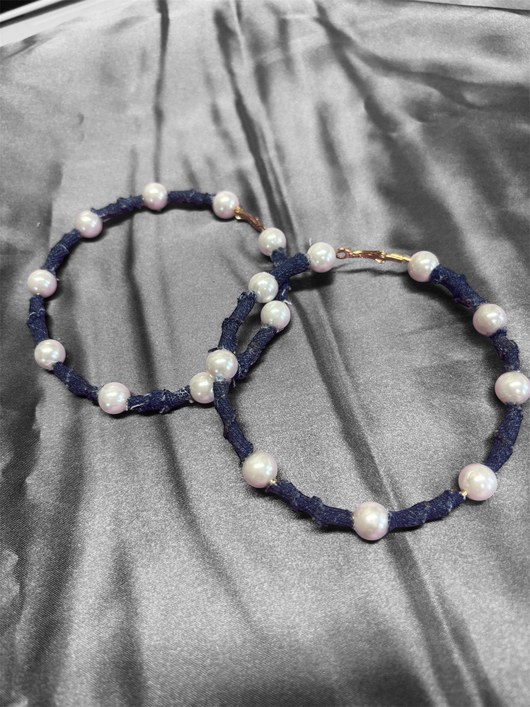 Denim Desire X- large hoops with denim and pearls. Very lightweight.