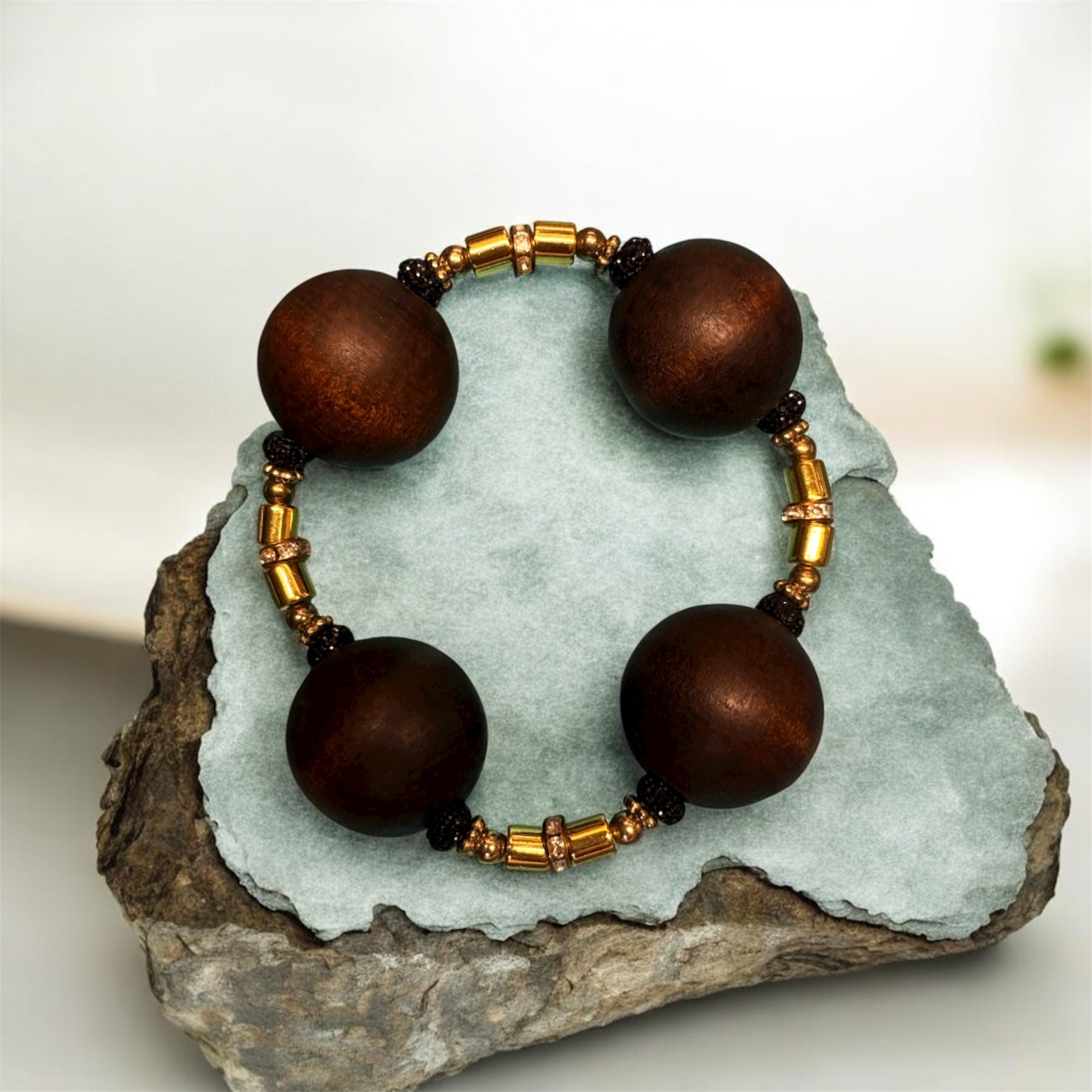 A expressive bracelet that is blended with dark wood focal beads, multi color wooden and gold bling spacers. A true statement of a classic man!