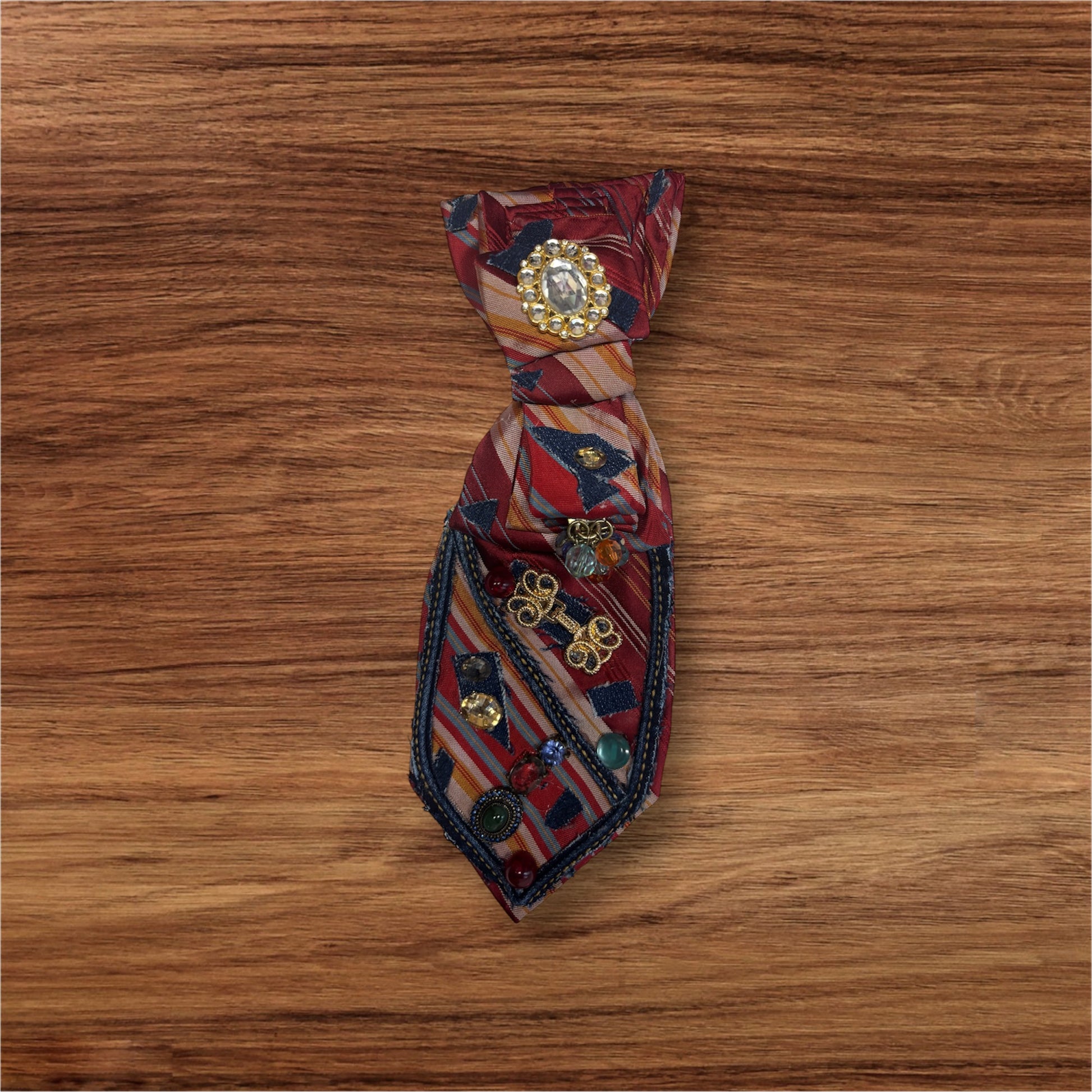 Custom Lavalliere with bright maroon, gold, crème and light blue base. Blue jean accents embellished with gold, colorful array of beads and diamond jewels.