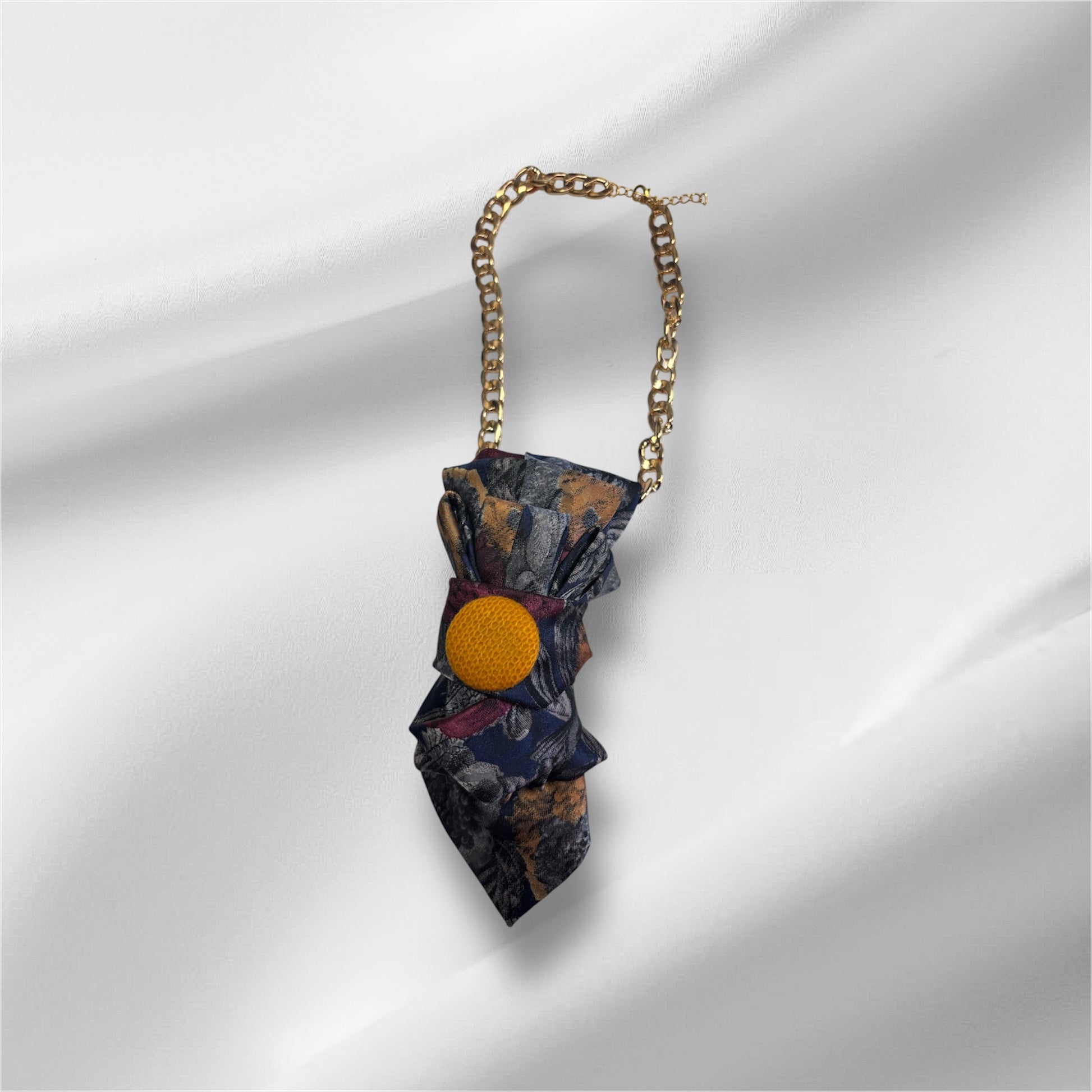 Add a custom lavalliere to your outfit. Stylish neckwear for the ladies. Multiple options to choose from. We also can customize for your special event or just your wardrobe choice. Blue, gold, silver and maroon. Embellished with gold vintage button. Available with more interchangeable options.