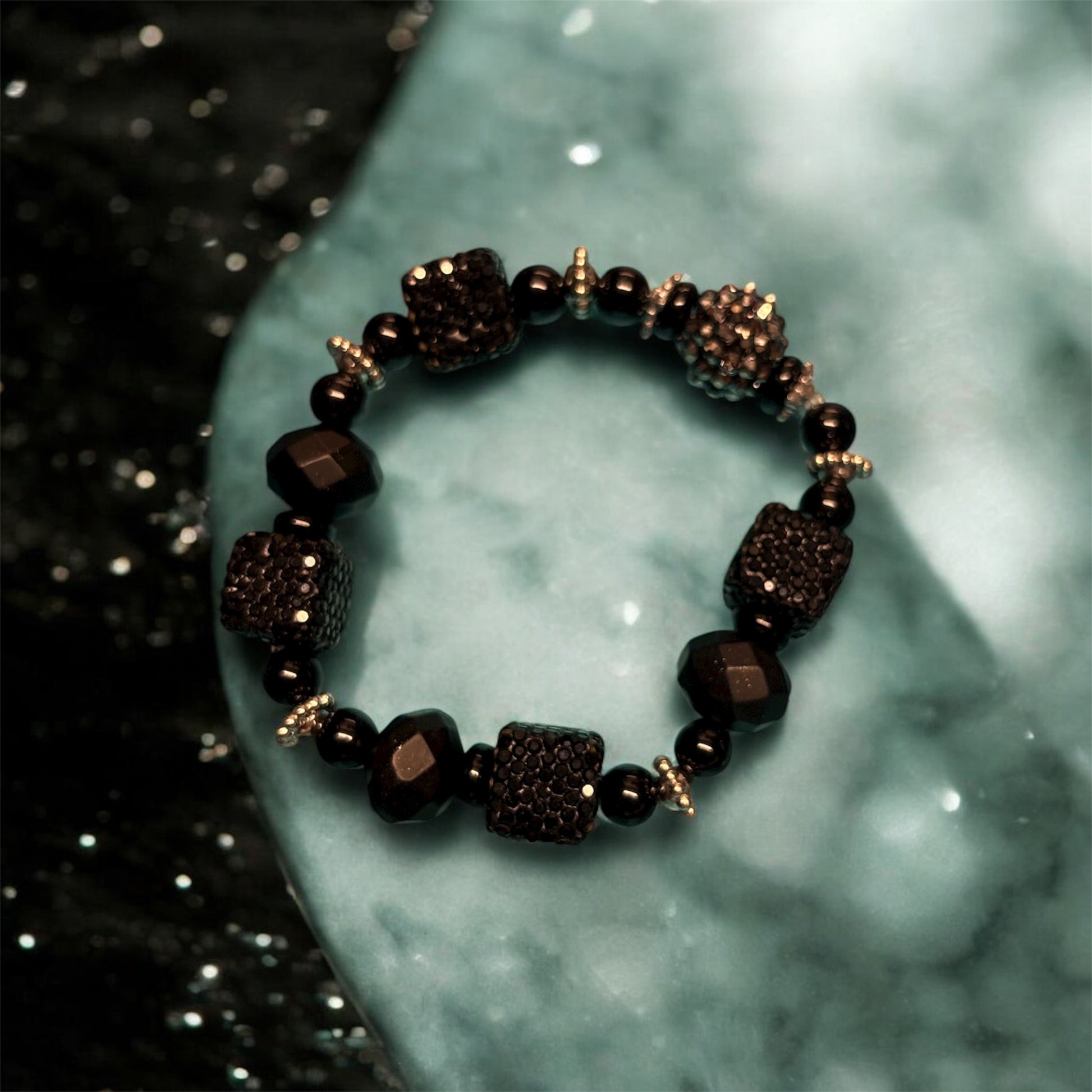 A expressive bracelet that is blended with large  focal beads, and sliver bling spacers. A true statement of a classic man!