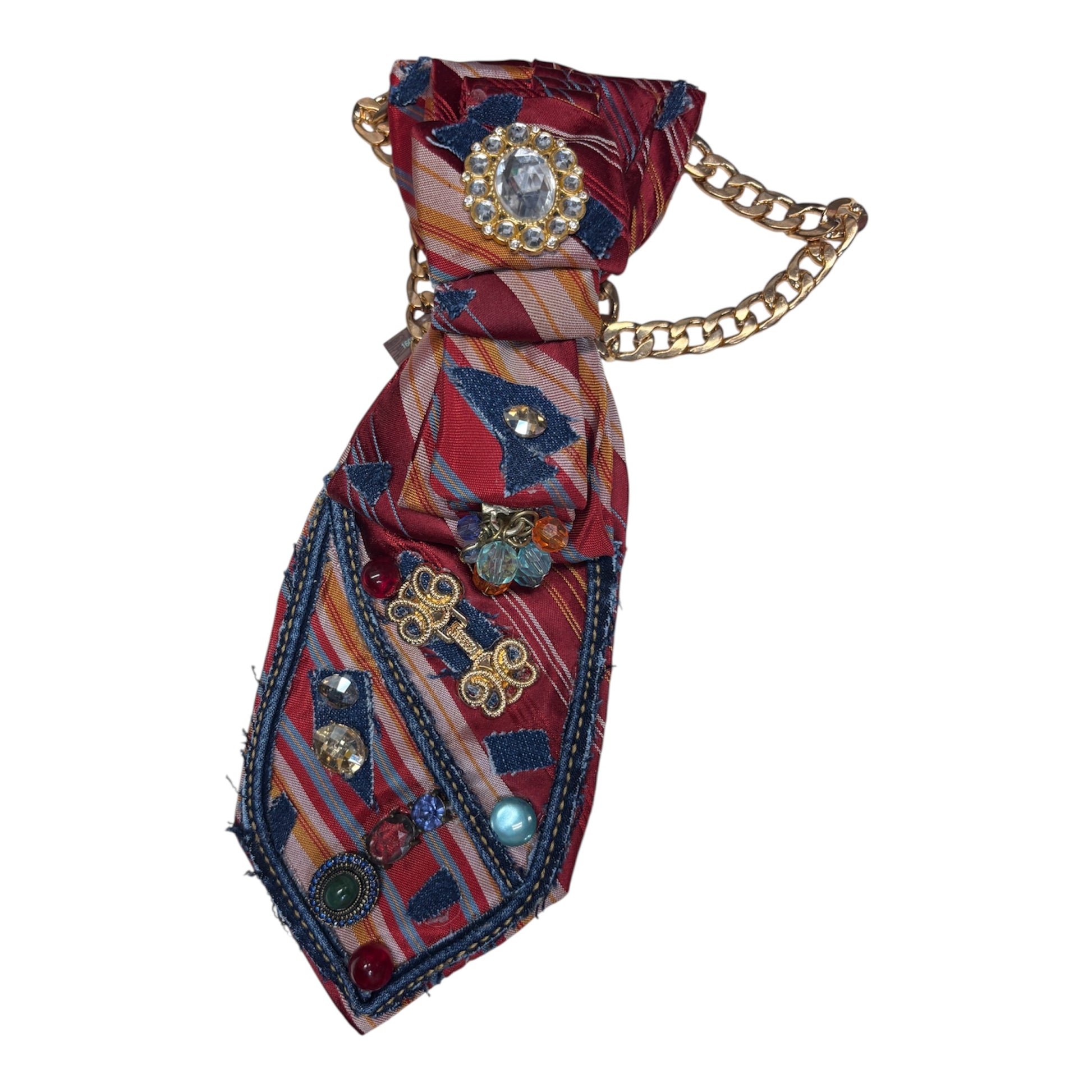 Elevate your style with Sabre', the must-have accessory for any fashion-forward individual. This stunning maroon and blue jean tie is adorned with gold and multi-colored jewels, adding a touch of opulence to any outfit. Perfect for making a statement, Sabre' is the perfect blend of luxury and trendiness.