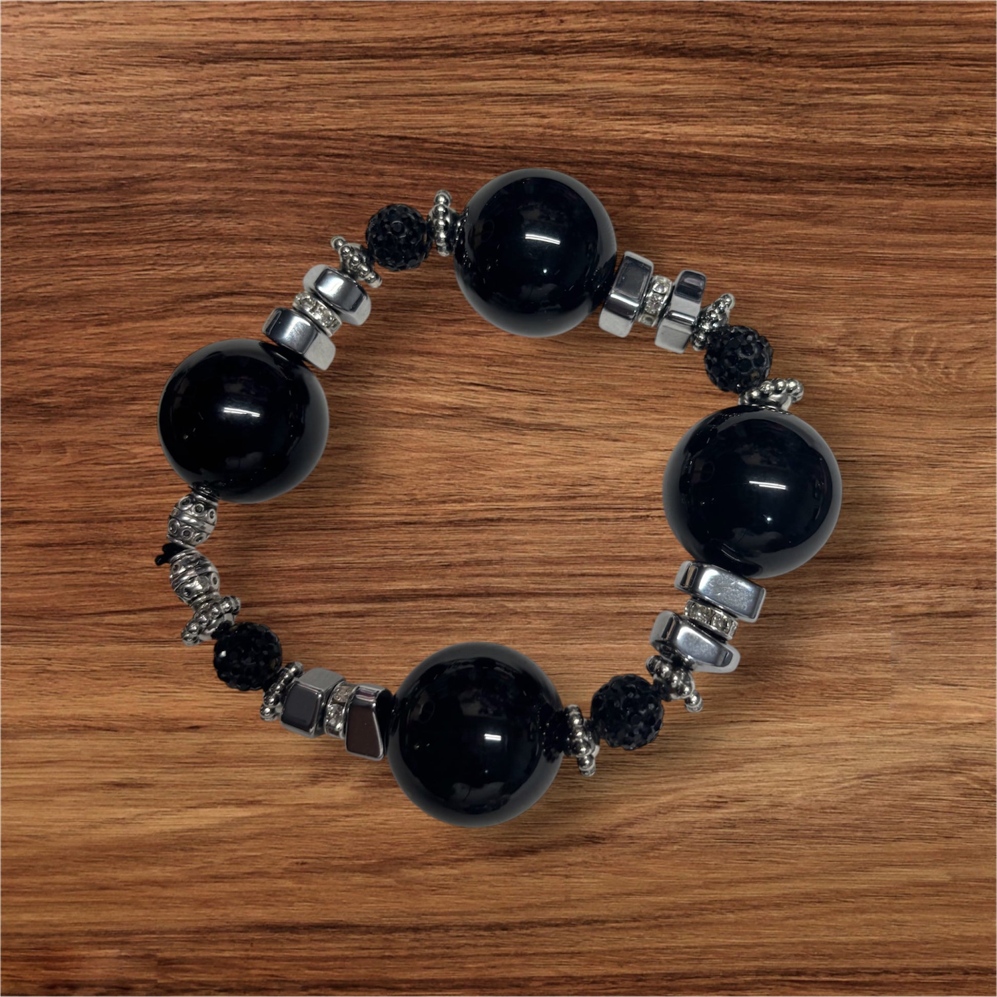 A expressive bracelet that is blended with large black focal beads,silver bling spacers. A true statement of a classic man!