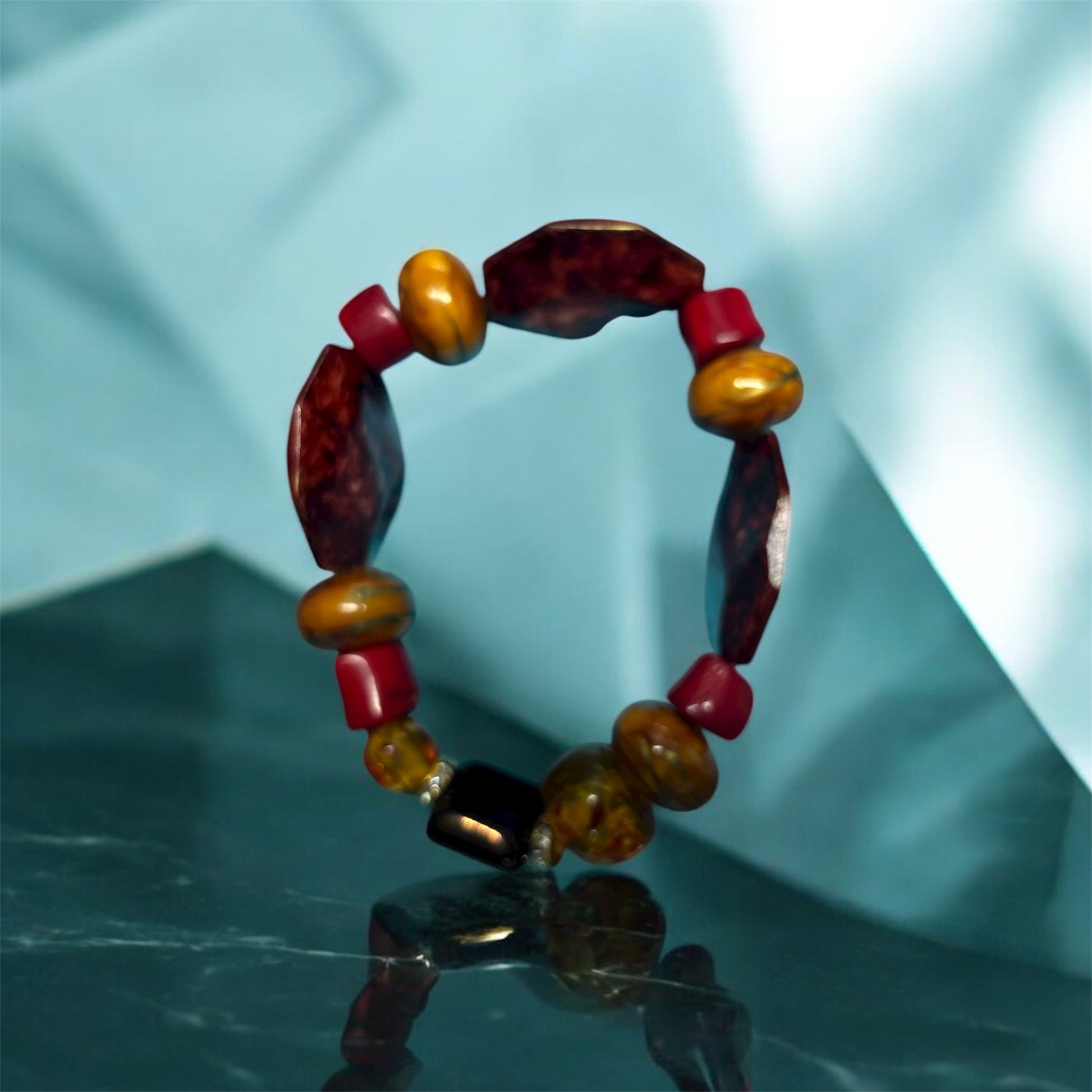A expressive bracelet that is blended with large  beads, mixture of reds, and gold beads. A true statement of a classic man!